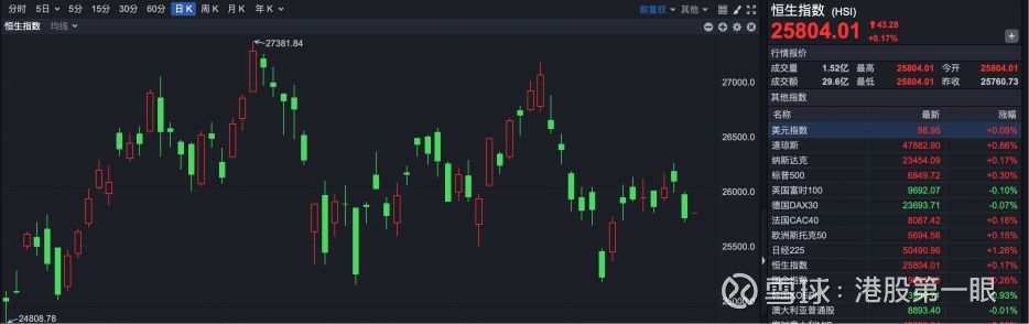 截至发稿,恒生指数报25804.01点,上涨43.28点,涨幅0.17%。