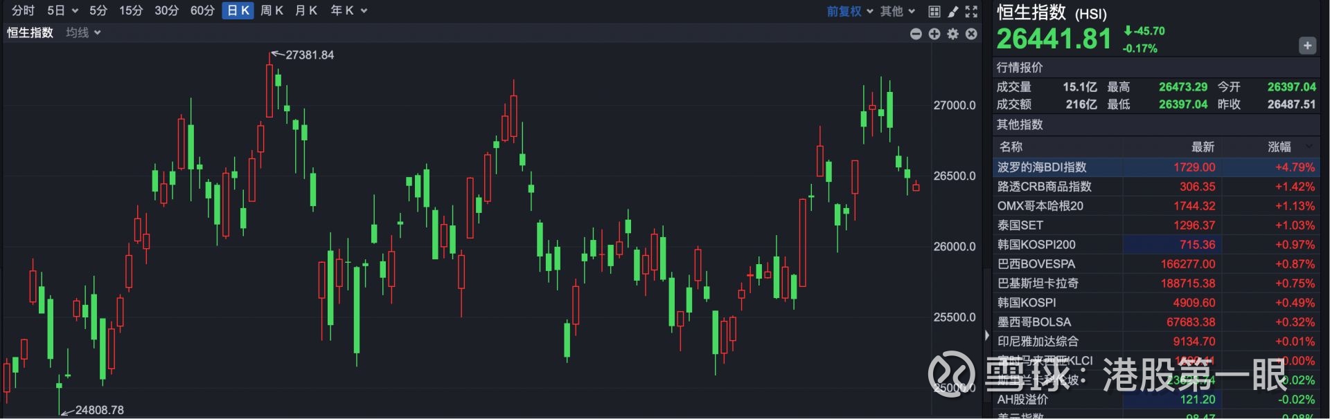 截至发稿,恒生指数报26441.81点,下跌45.70点,跌幅0.17%。