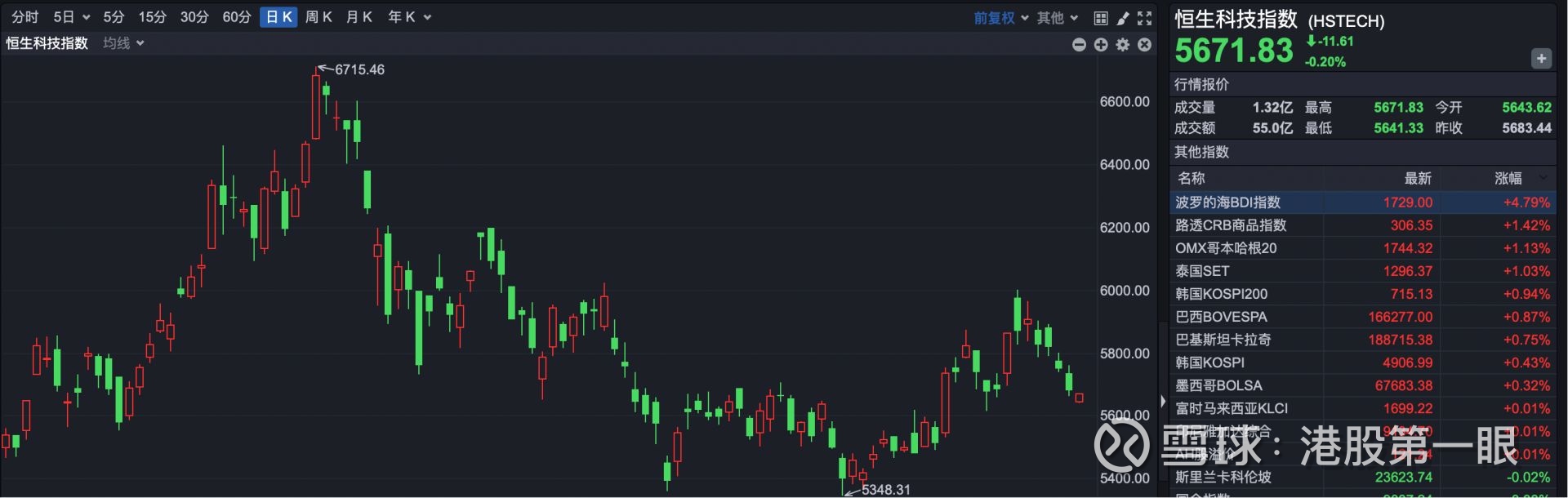恒生科技指数报5671.83点,下跌11.61点,跌幅0.20%。