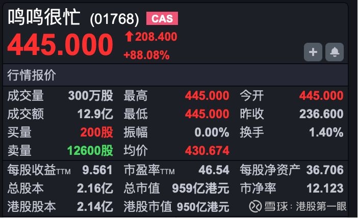新股方面,鸣鸣很忙(HK01768)上市首日高开超88%,股价报445港元,总市值达959亿港元。