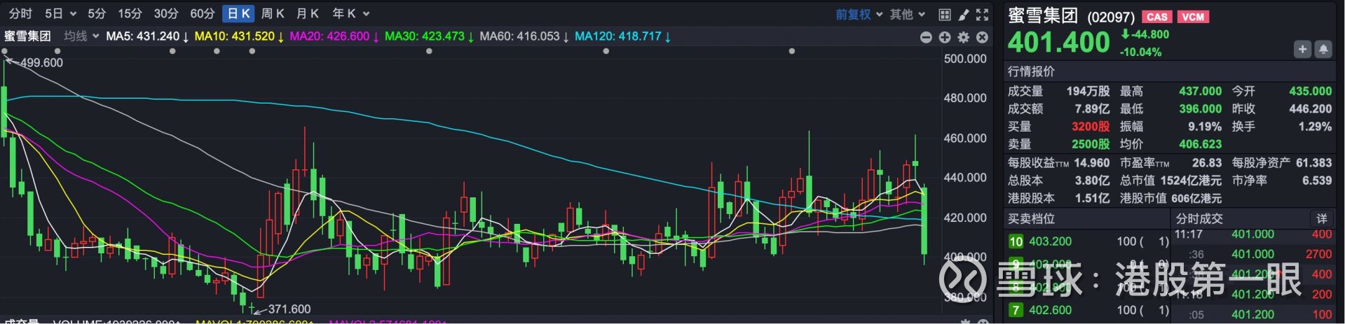 今日(1月28日)上午,蜜雪集团(HK02097)早盘小幅跳空低开,随后跌幅迅速扩大。截至发稿,蜜雪集团跌超10%,盘中最低报396港元。