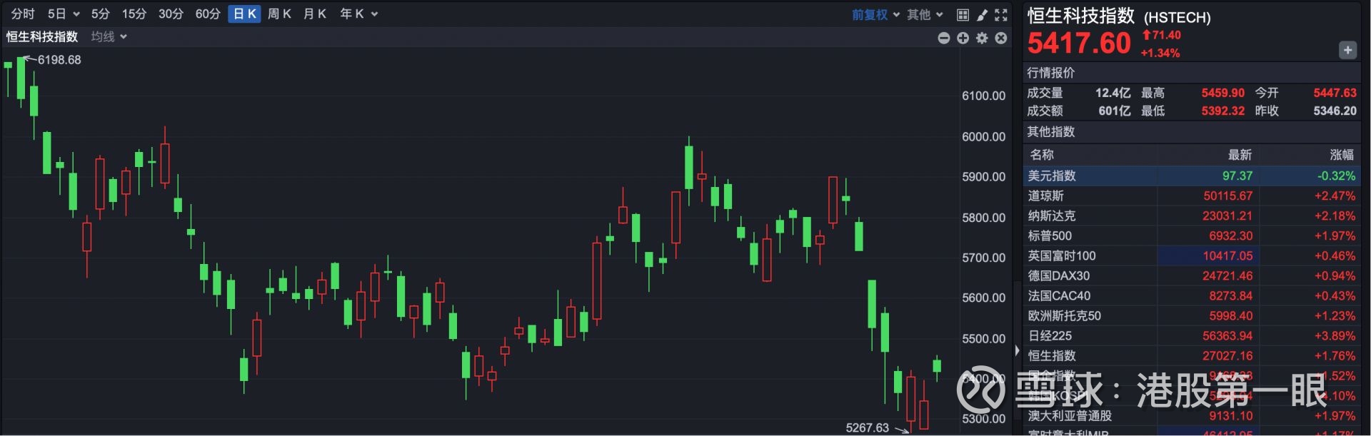 恒生科技指数收盘报5417.60点,上涨71.40点,涨幅1.34%。