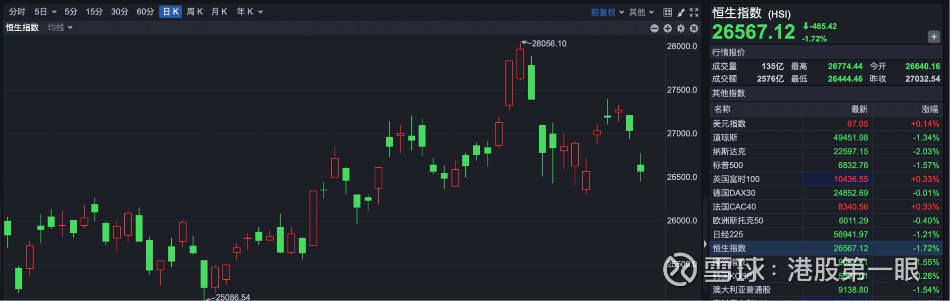 截至收盘,恒生指数报26567.12点,下跌465.42点,跌幅1.72%。