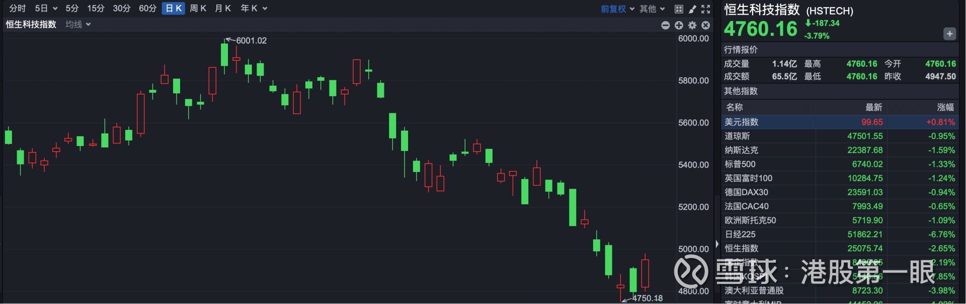 恒生科技指数开盘报4760.16点,下跌187.34点,跌幅3.79%。
