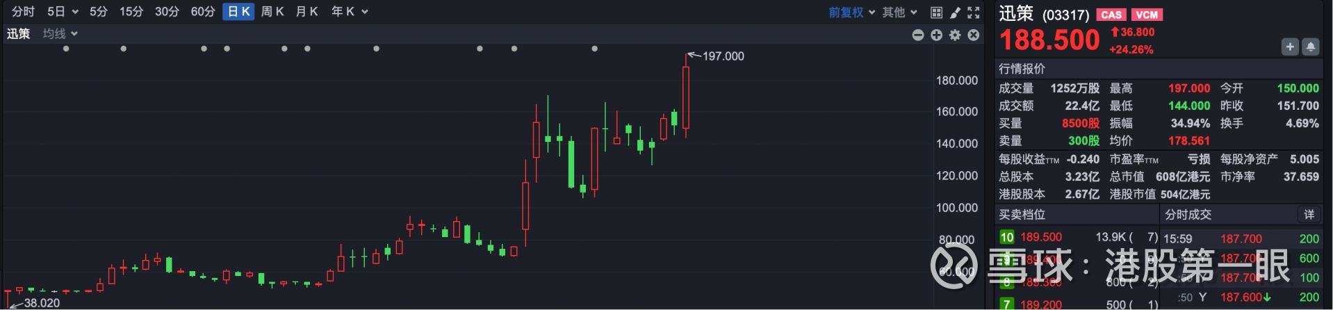 焦点公司方面,“Token”第一股迅策(HK03317)盘中一度大涨近30%,最终收盘涨超24%,成为今日市场最大焦点。今日收盘,迅策创出上市以来新高,总市值突破600亿港元,股价较发行价大涨290%。