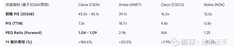 纵向对比:Ciena 的 TTM PE 高达 ~280x ,主要受 2024 年去库存周期导致利润极低的影响。然而,前瞻 PE 仅为 44x 左右,远低于其 2026 年预计超过 100% 的盈利增速