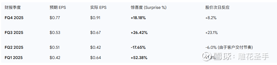 分析:除 Q2 因特定客户物流波动外,其余季度均大幅击败预期,平均惊喜度高达 22.98% 23。