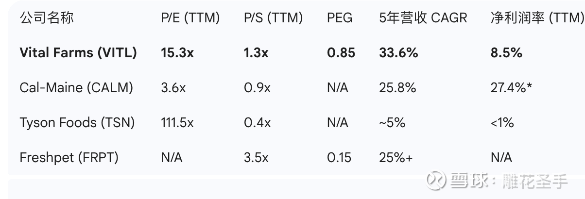 投资者常将 Vital Farms 误认为是传统的农产品公司。通过与行业巨头 Cal-Maine Foods (CALM) 及高增长消费股的对比,其独特性显而易见: