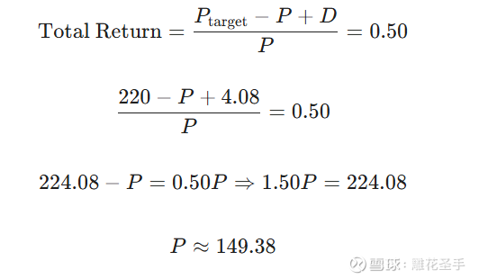 目前分析师给出的牛市高位价格目标为 $220 。 设买入价格为 $P$,股息为 $D = 4.08$ 。 总回报公式为: