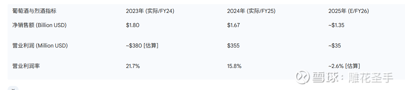 异常: 2024 自然年(FY25)账面因葡萄酒与烈酒业务计提了 $33 亿非现金减值而显示 GAAP 亏损 。