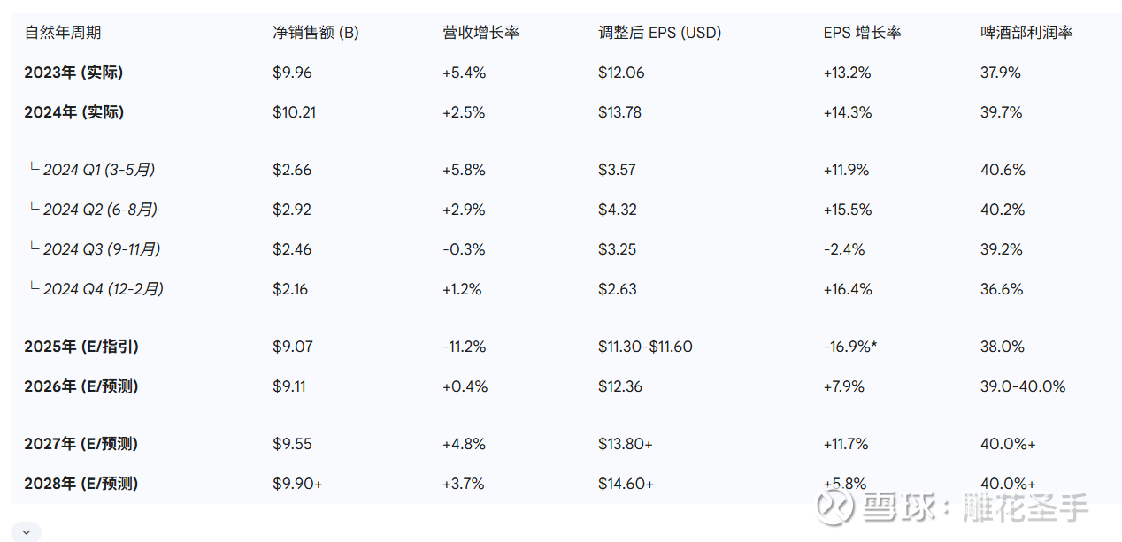 根据财报历史数据与管理层修正指引,STZ 核心指标汇总如下: