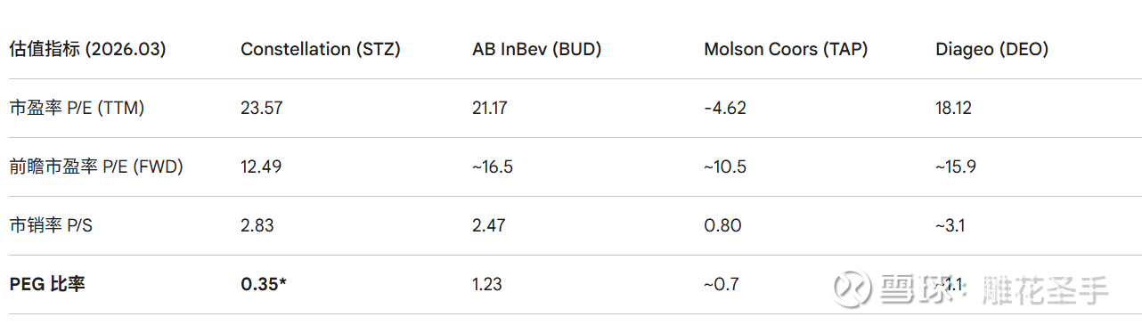 STZ 曾经因其高成长性而享有显著溢价,但 2026 年初其市盈率已收缩至与成熟增长缓慢的 BUD 和 DEO 相近的水平。
