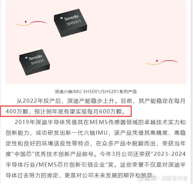 深迪自2018-2019年开始专注于按照华为的指标开发手机IMU产品,2019年-2024年,深迪进行了3款产品大版本迭代,不断解决产品可靠性和性能问题,并历经多年迭代优化,已基本打磨跑通晶圆、封装等生产工艺,逐步完成了华为贴片测试、项目测试、整机测试、试产等前序验证,2024年华为下达了kk级别的量产订单,是最先推进至整机量产的国产IMU厂商。