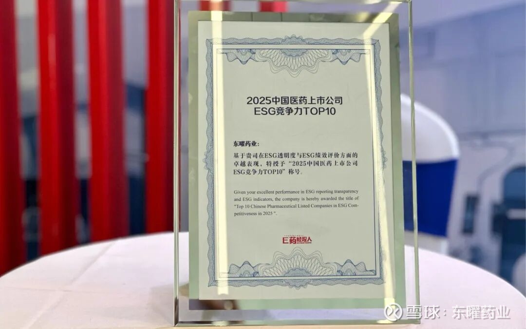 连续三年入选“中国医药上市公司ESG竞争力TOP榜单”,2025年再度跻身TOP10,体现了东曜在ESG治理与实践上的持续领先