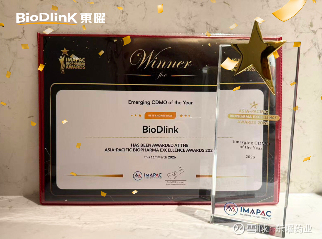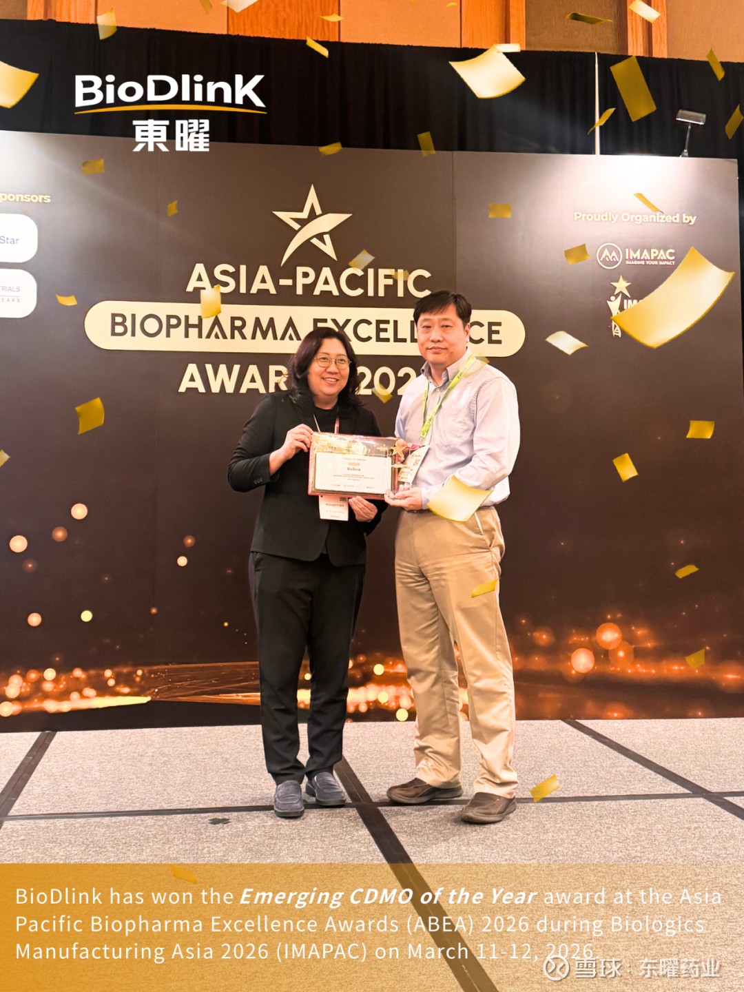 近日,东曜药业(股票代码:1875.HK)在2026年亚太生物医药卓越奖(Asia Pacific Biopharma Excellence Awards 2026)评选中,荣获"Emerging CDMO of the Year"殊荣。这一权威奖项充分肯定了东曜药业在推动亚太地区生物医药产业发展中的突出贡献。