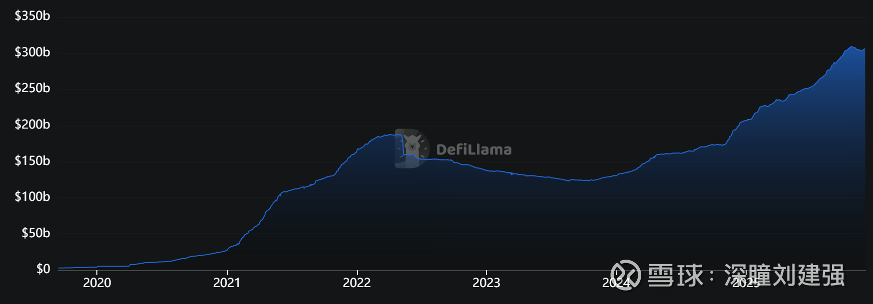 稳定币市场 "五年十倍增长" 的预期,不仅不是夸张,反而可能是保守的。稳定币市场规模截止2025年12月2日为3060亿美元。下图是自2020年以来稳定币市值增长情况: