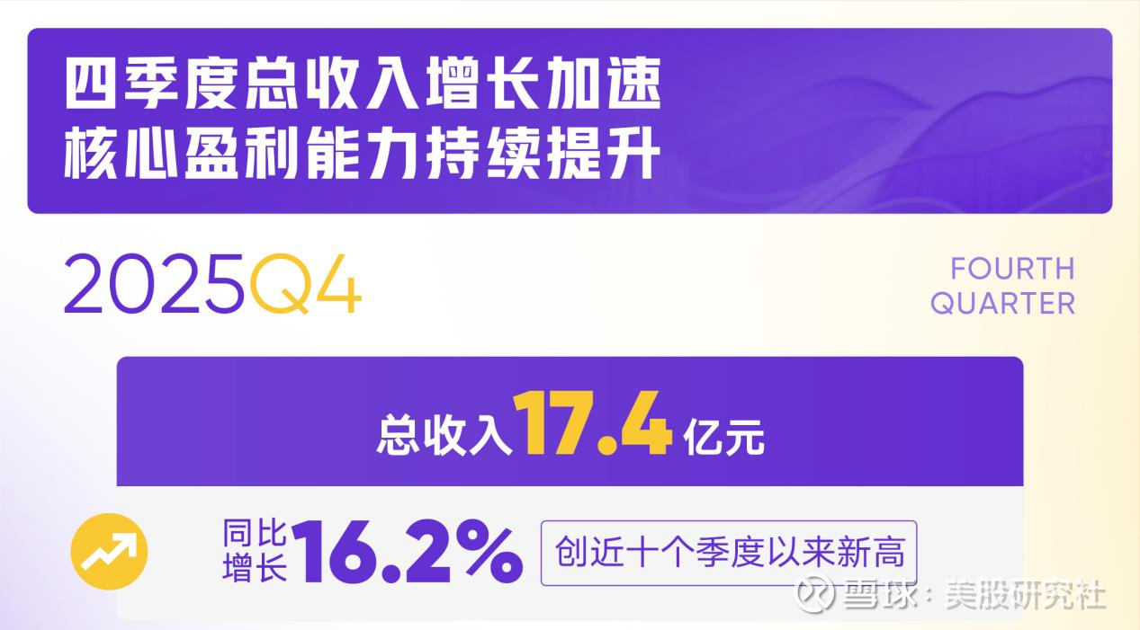 2025年第四季度,虎牙实现营收17.4亿元,创近10个季度新高。其中,游戏相关服务、广告及其他收入同比大增59.4%至5.9亿元,单季收入占比逼近30%。内容生态的稳健和多元业务的快速拉动,使得公司经调整运营利润连续三个季度为正并持续提升。纵观2025全年,业绩表现也可圈可点,总收入同比增长7%至65亿元,基本面步入增长拐点,并实现Non-GAAP净利润9950万元。