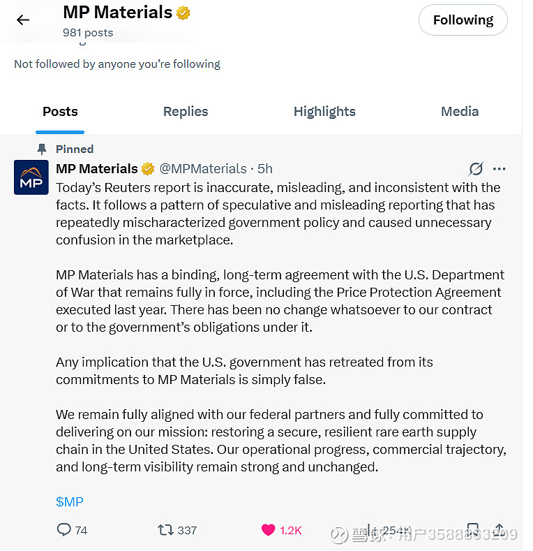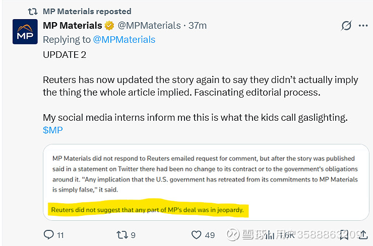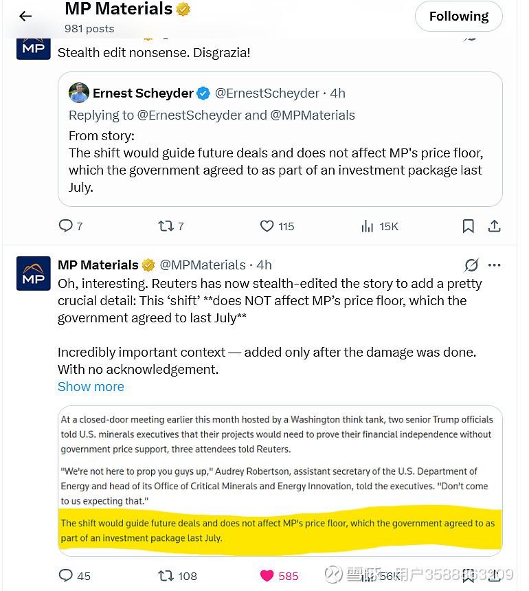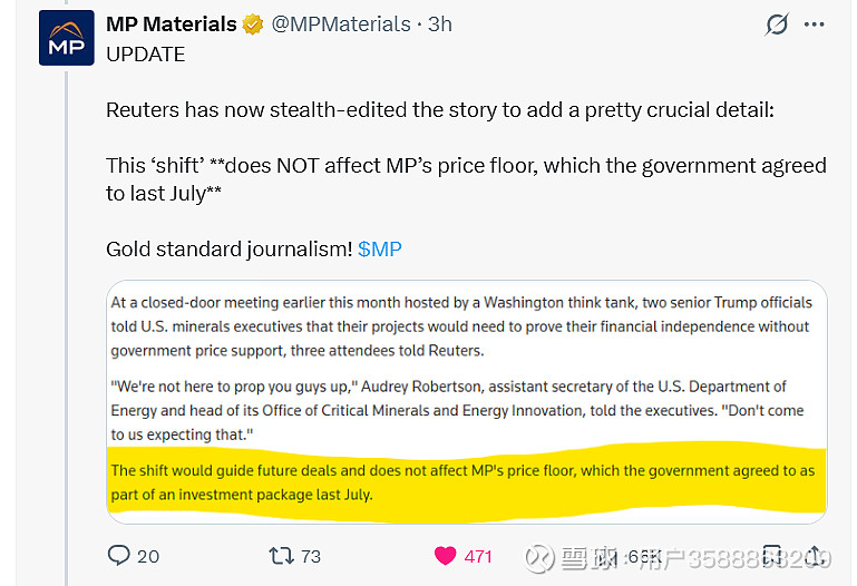 MP在X上发了5条贴文回应了路透社的这篇报道,完全是bullshit,MP的政府保底价格是不受这篇报告所说的影响的,路透社后面自己修改了文章。你们感兴趣的自己去X看吧。