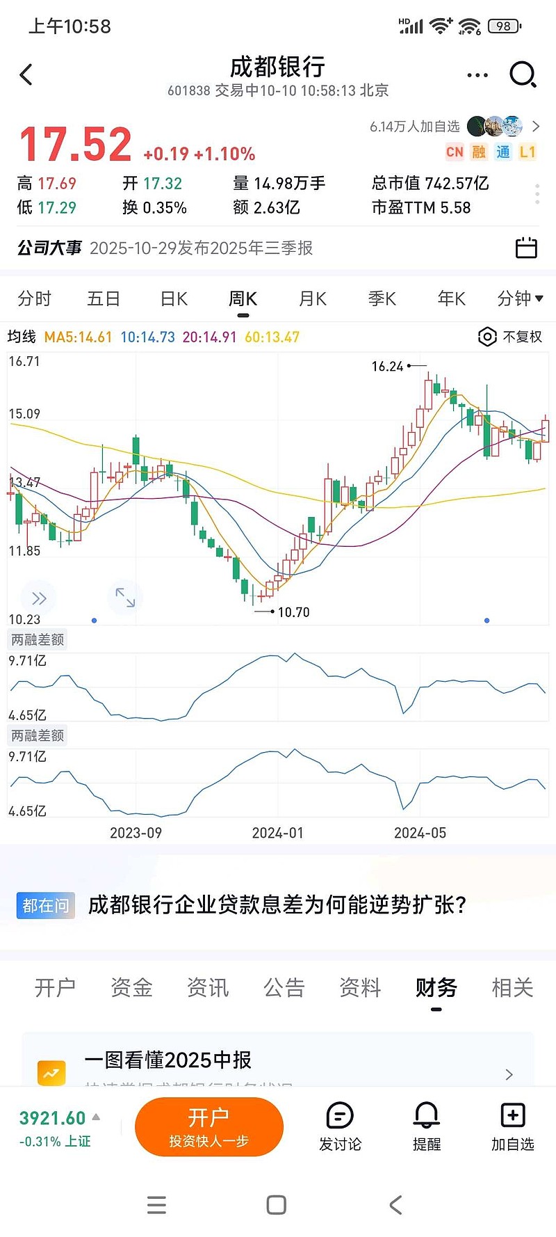 $成都银行(SH601838)$成都银行等几个基本面优秀的银行股在23年底忽然莫名其妙地大跌, 成都银行股价一口气跌至10.70元,其当时PB0.68,股息率达到8.38%。后来一口气涨了70%。以后日子里, 成都银行等优秀银行股还会重复那一幕! 如果说学历史有价值的话, 回望银行股历史, 会得到启发。等这一幕重复,我会毫不犹豫地满仓满融单吊!抄送杭州银行, 江苏银行,南京银行。我敢打赌, 这一幕会反复出现,只要有耐心和勇气。这些机会,都是纳米散户制造的!