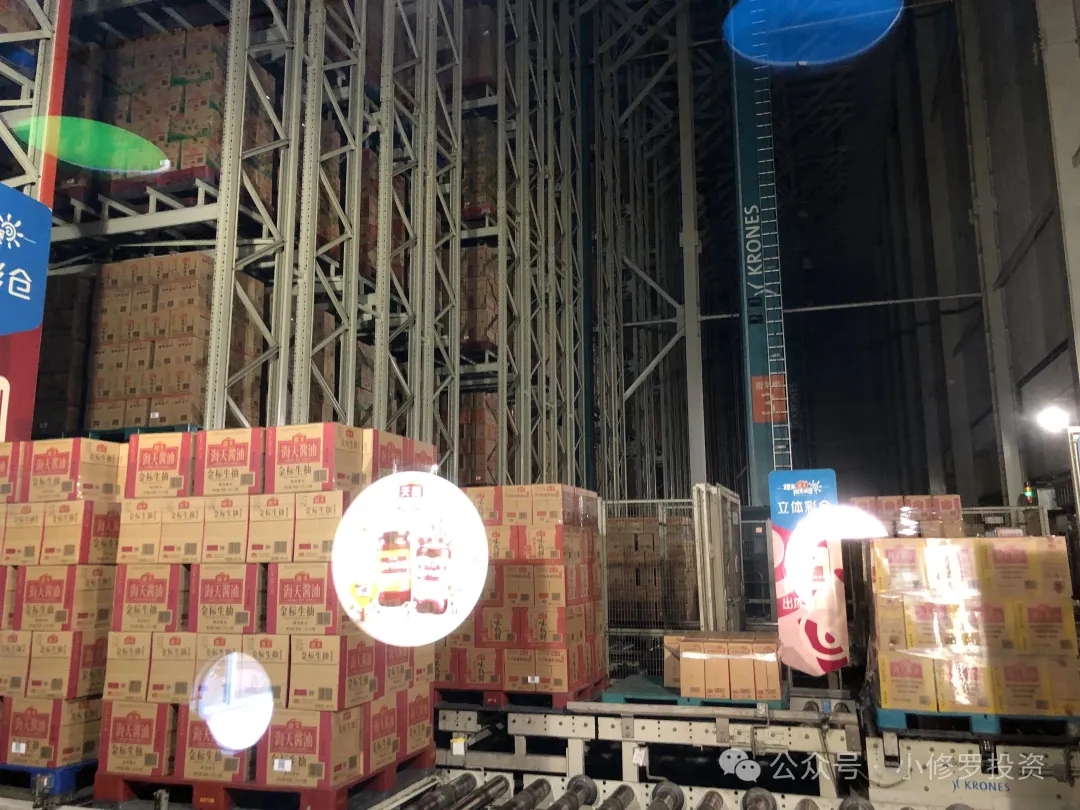 立体仓库升降台码放好一箱箱酱油,最终由物流系统自动发货。