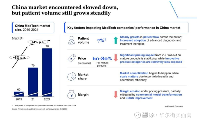 麦肯锡认为,虽然国内就诊患者人次仍保持年均7%的增速,但由于集采等原因,商品价格有所下降,国内医疗器械/耗材增速从8%(2019-2021年)下降至4%(2021-2024年)。