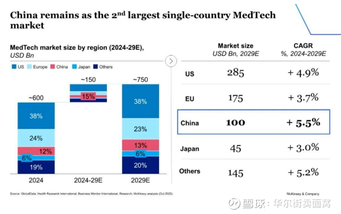 尽管如此,麦肯锡还是认为中国区医疗器械/耗材2024-2029年能保持5.5%的增速,领先全球主要经济体,并与2029年达到千亿美元水平。