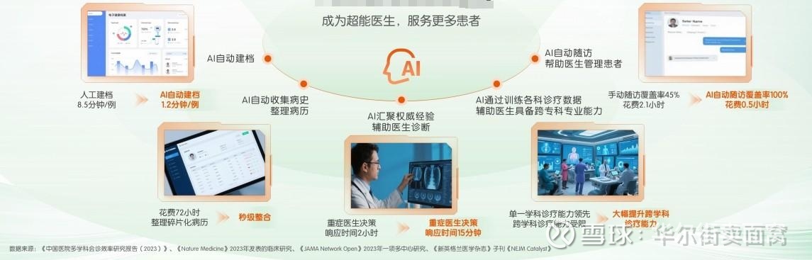 AI可辅助医生建档、整理病例、患者管理、随访等多环节节约时间。如$平安好医生(01833)$ 今年初推出的AI服务“平安芯医”已覆盖20余个真实医疗场景。“平安芯医”让患者等待时间由4.5天降低至即时,会诊中等待时间由9.7天变为“一键直通”,普通患者无需托关系、无需转诊就能获得不同医院、不同科室名医在线会诊。