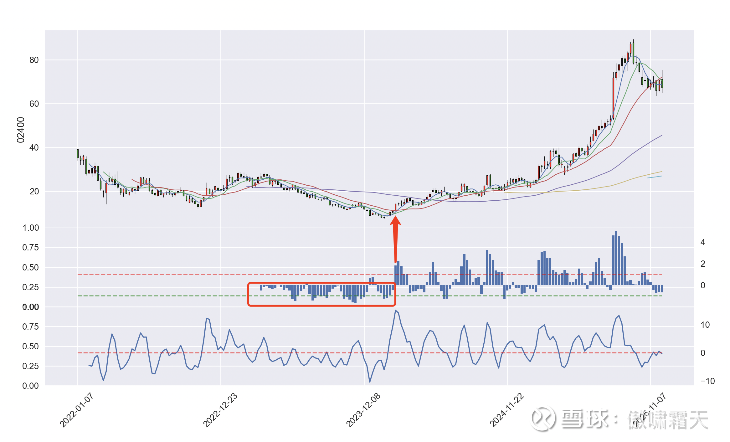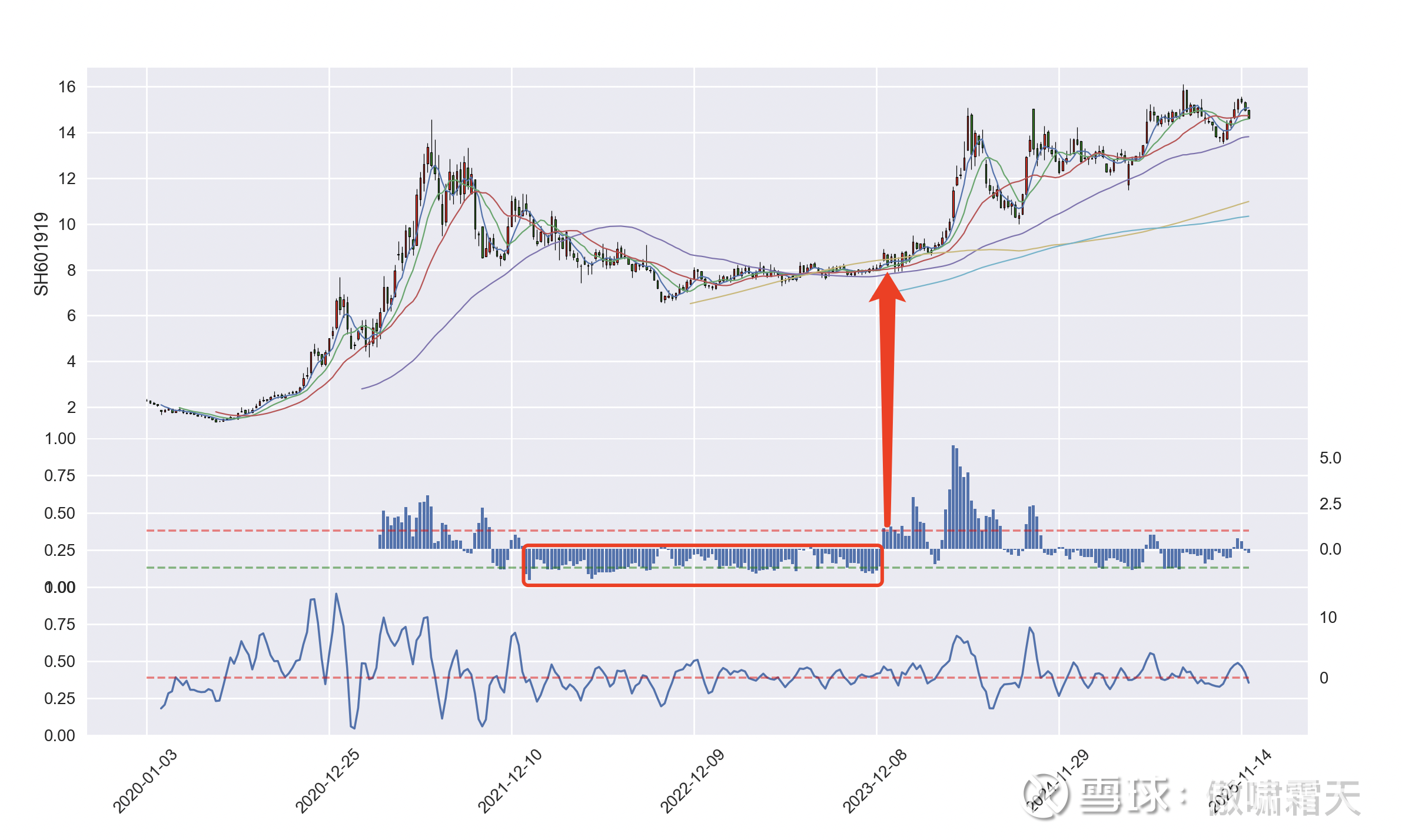 2 我们再来看一个更典型的标的,中远海控,如下图所示,中远在2022年初到2024年初震荡整理了两年,这段时间的指标几乎都是负的,极度地磨人阶段,直到指标>1之后,慢悠悠开始了拉升阶段。不过话说回来,虽然资金被耗在里面两年,但似乎又躲过了这两年的熊市行情:),此处应该at一下@HIS1963