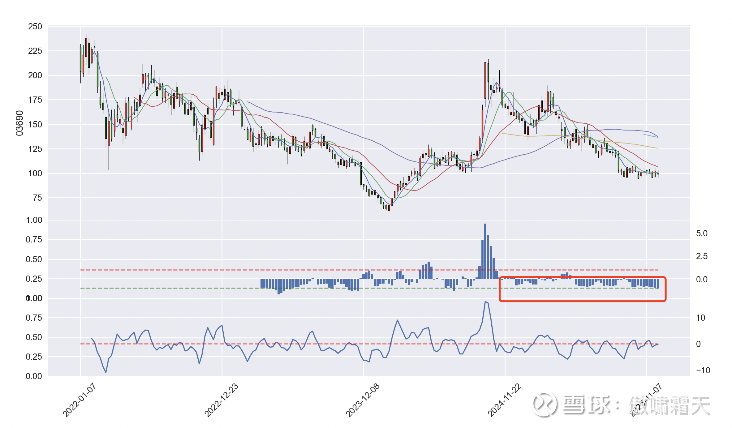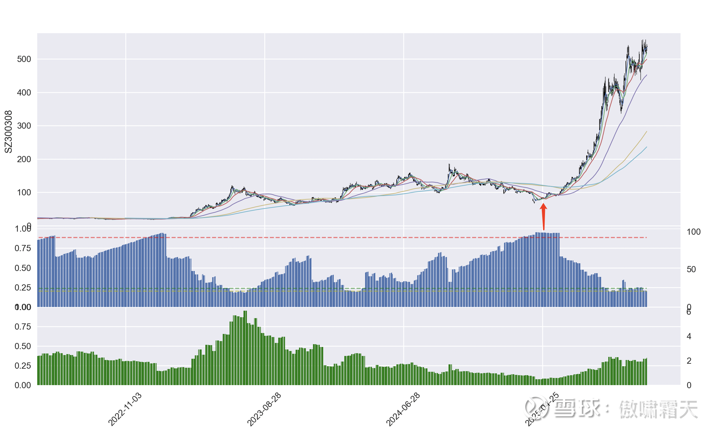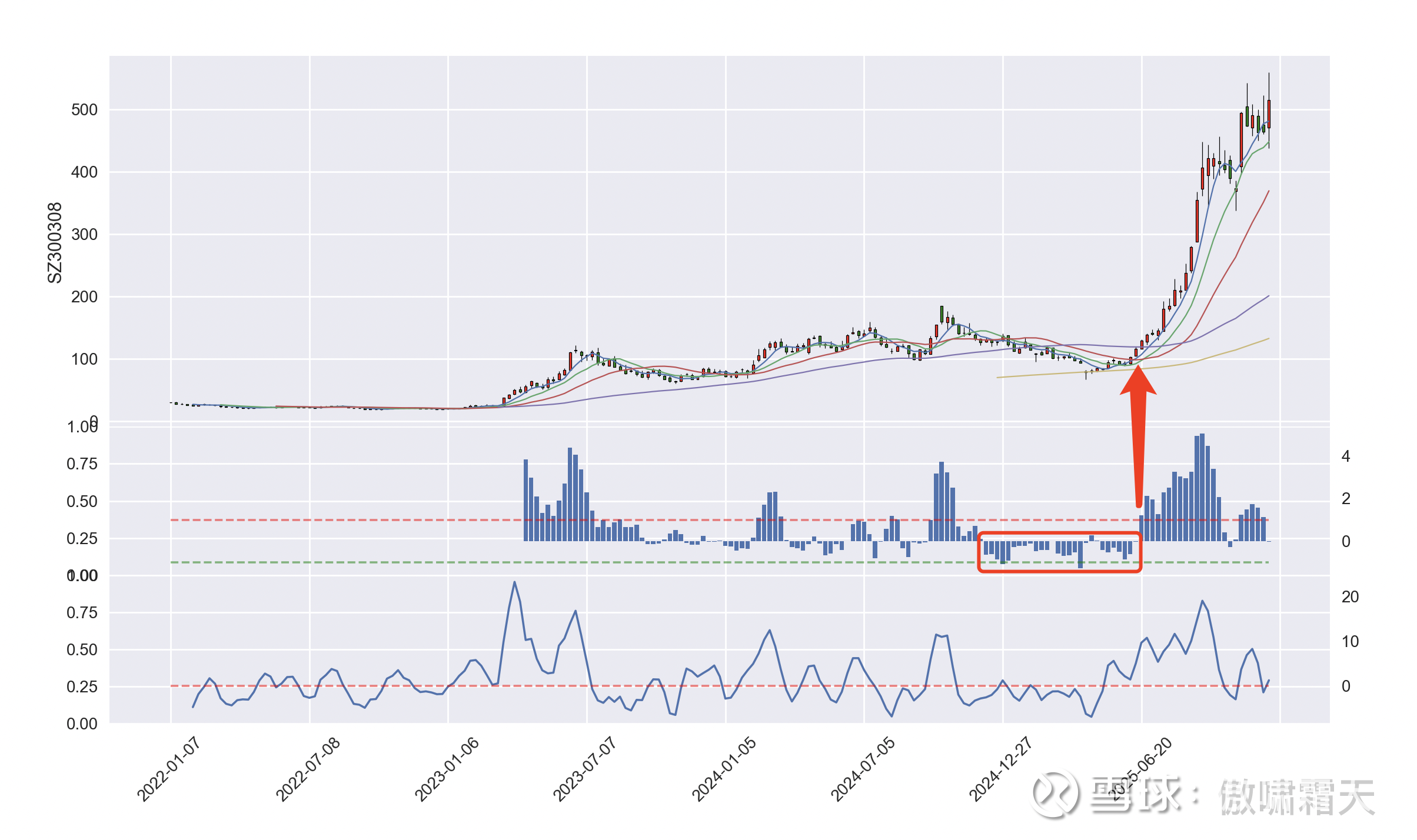 3 我们继续看下中际旭创的数据,中际旭创作为一只大牛股,无论从行业发展趋势还是技术指标角度,都非常值得研究。如下,依然能够画出连续的负数区间和突破信号。