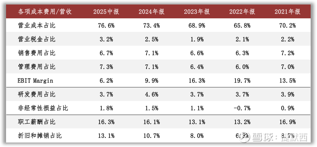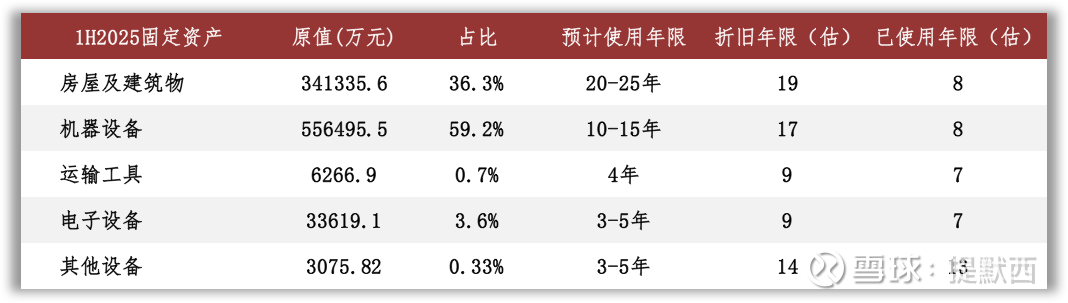 核心资产中重点关注固定资产和无形资产等。根据2025年中报数据估算,房屋及建筑物在固定资产中占比36%(按原值计算,以下同),折旧年限约为19年,已使用年限约8年;机器设备在固定资产中占比59%,折旧年限约为17年,已使用年限约为8年。