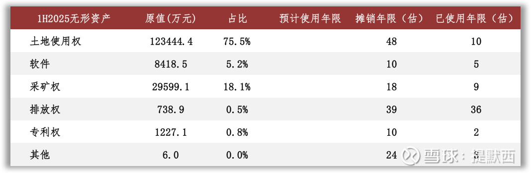 无形资产主要包括土地使用权和采矿权。根据2025年中报数据估算,土地使用权在无形资产中占比76%,摊销年限约为48年,已使用年限约为10年;采矿权在无形资产中占比18%,摊销年限约为18年,已使用年限约为9年。