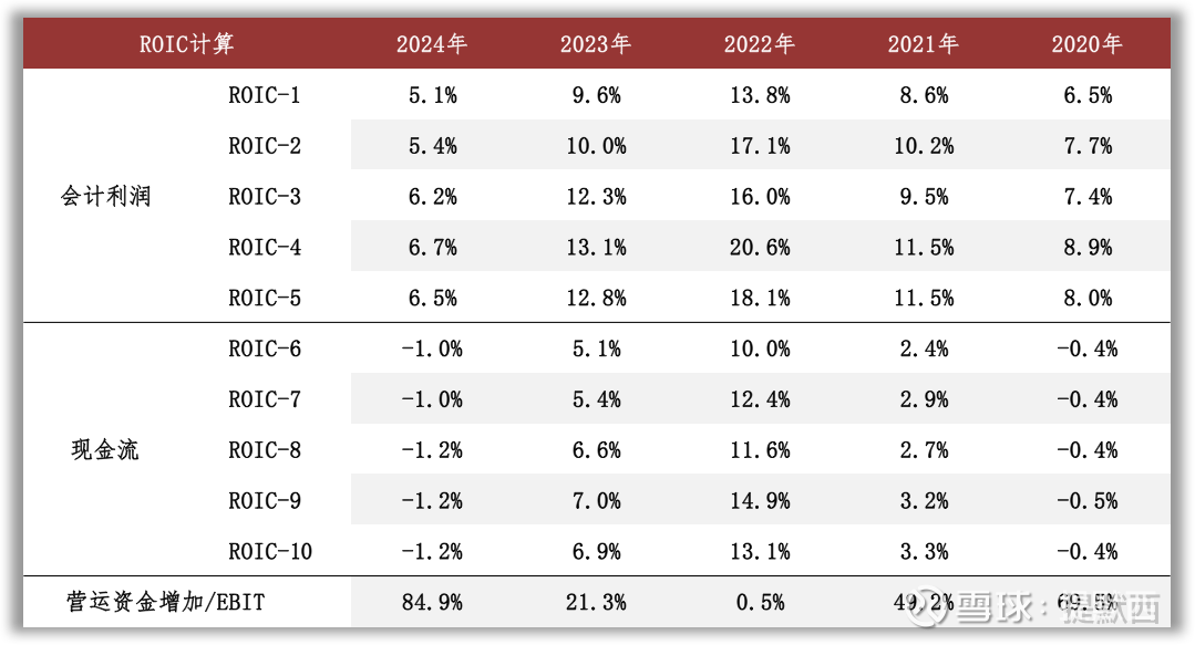 2024年按现金流计算的ROIC显著低于按会计利润计算的ROIC,会计利润和现金流的差额主要来自营运资金和研发投入。根据年报中的说明,2024年公司经营活动产生的现金流量净额同比减少54.31%,主要原因为主要产品价格下降,销售商品收到的现金减少;观察现金流量表补充资料,营运资金增加主要归因于应付/预收项目金额减少。