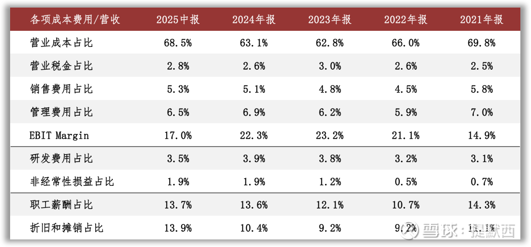 营业成本是影响公司EBIT的主要扣减项目。公司的营业成本主要包括直接材料、直接人工、制造费用等项目,2024年直接材料占比约68%。