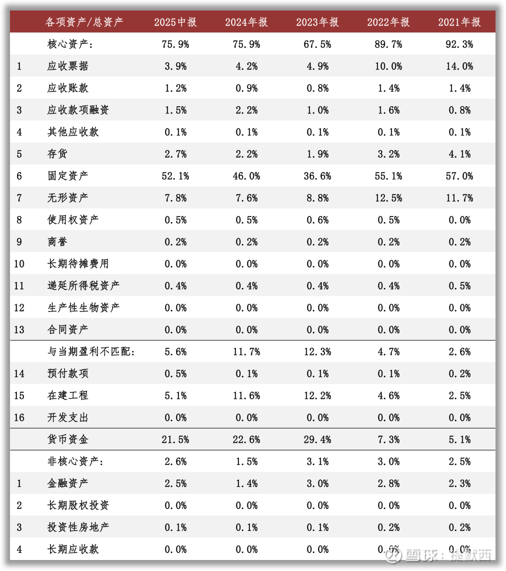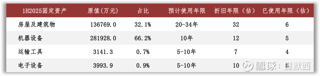 核心资产中重点关注固定资产和无形资产等。根据2025年中报数据估算,房屋及建筑物在固定资产中占比32%(按原值计算,以下同),折旧年限约为32年,已使用年限约6年;机器设备在固定资产中占比66%,折旧年限约为12年,已使用年限约为5年。