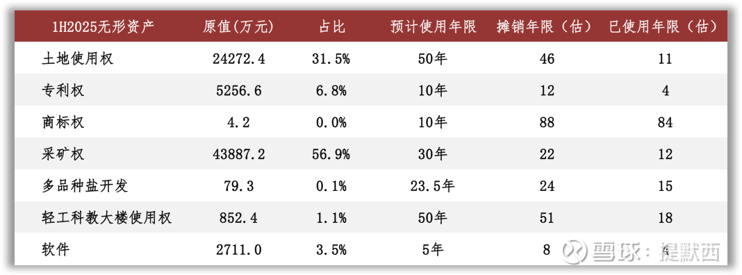 无形资产主要包括土地使用权和采矿权。根据2025年中报数据估算,土地使用权在无形资产中占比32%,摊销年限约为46年,已使用年限约为11年;采矿权在无形资产中占比57%,摊销年限约为22年,已使用年限约为12年。