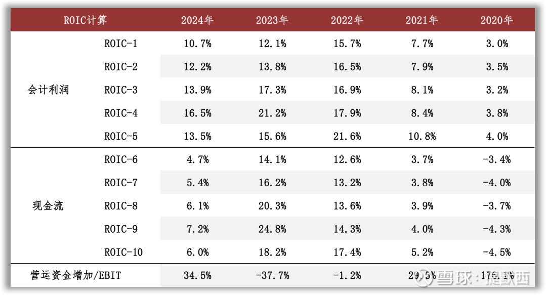 2024年按现金流计算的ROIC显著低于按会计利润计算的ROIC,会计利润和现金流的差额主要来自营运资金投入。根据年报中的说明,2024年公司经营活动产生的现金流量净额同比减少48.29%,主要原因为营业收入减少、支付的采购款项有所增加;观察现金流量表补充资料,营运资金增加主要归因于应收/预付项目占用的资金增加以及应付/预收项目金额减少。