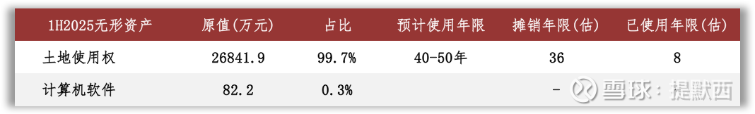无形资产几乎都是土地使用权,根据2025年中报数据估算,土地使用权的摊销年限约为36年,已使用年限约为8年。