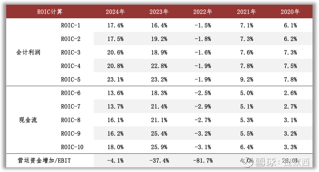 对于ROIC,沿用在《筛选股票的时候如何用好ROIC》中提出的计算方式,分子采用两种口径,分母采用五种口径,计算10项ROIC指标并进行观察。这些ROIC指标主要用于公司间比较,计算时未从EBIT中扣除所得税。