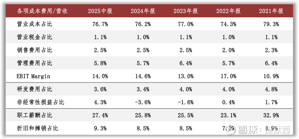 营业成本是影响公司EBIT的主要扣减项目。公司面料产品的营业成本主要包括原材料、人工工资、能源、制造费用等项目,2024年原材料占比47%、人工工资占比18%、能源占比18%;服装产品的营业成本主要包括原材料、人工工资、制造费用等项目,2024年原材料占比60%、人工工资占比26%。