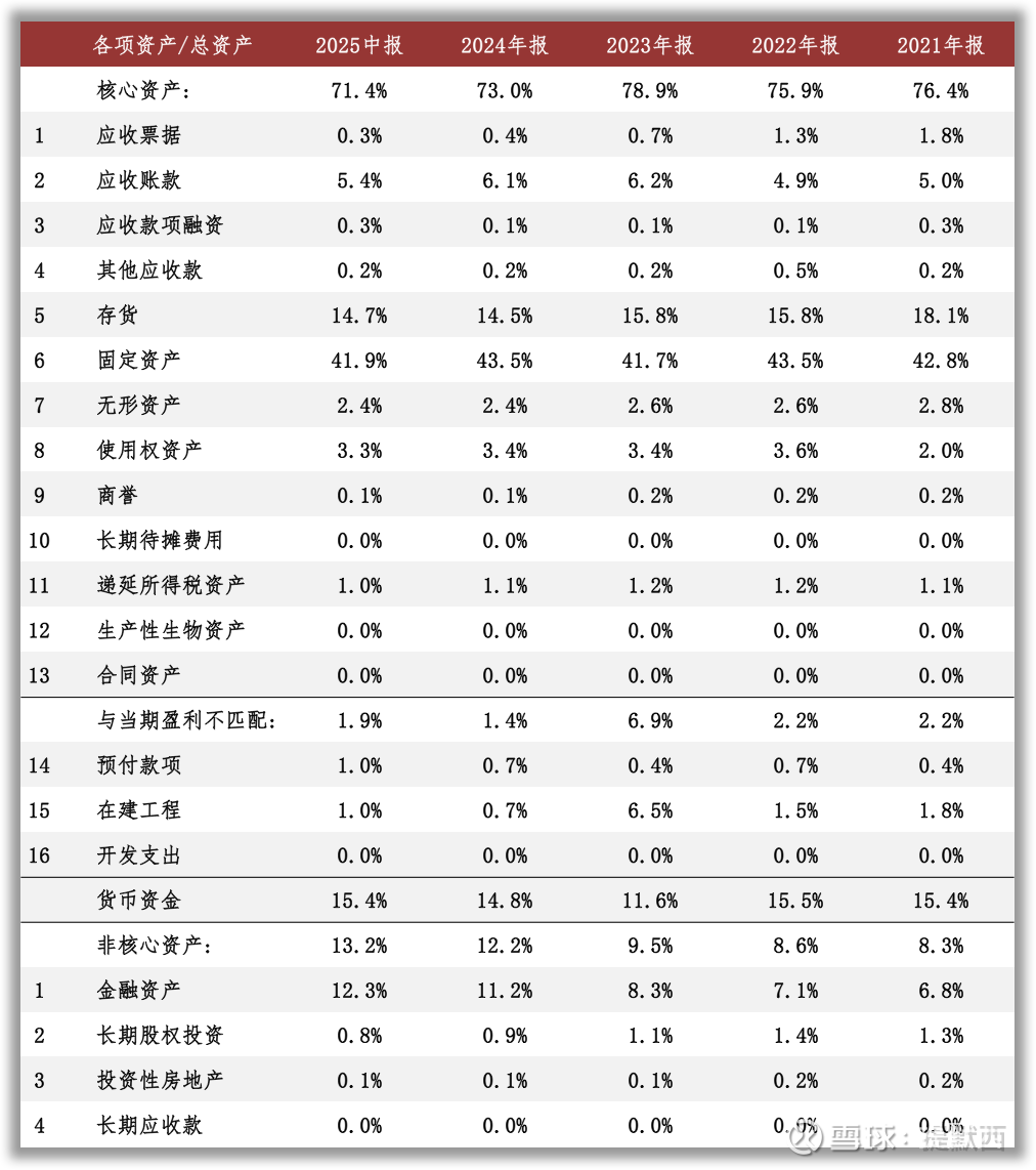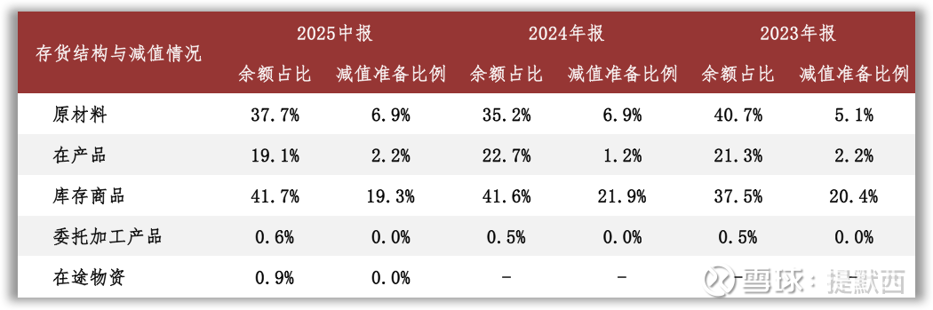 核心资产中重点关注存货和固定资产等。根据2025年中报数据,存货账面余额中库存商品占比42%,库存商品计提的减值准备比例为19%;以近三年的平均营业成本为基数进行计算,2025年二季度末库存商品的周转天数为59天。