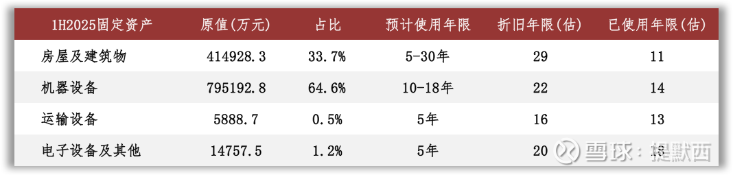 根据2025年中报数据估算,房屋及建筑物在固定资产中占比34%(按原值计算,以下同),折旧年限约为29年,已使用年限约为11年。作为对照,看一下土地的已使用年限:根据2025年中报数据估算,土地使用权在无形资产中占比99%,摊销年限约为47年,已使用年限约为14年。