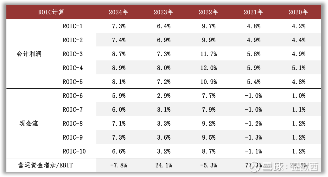 对于ROIC,沿用在《筛选股票的时候如何用好ROIC》中提出的计算方式,分子采用两种口径,分母采用五种口径,计算10项ROIC指标并进行观察。这些ROIC指标主要用于公司间比较,计算时未从EBIT中扣除所得税。