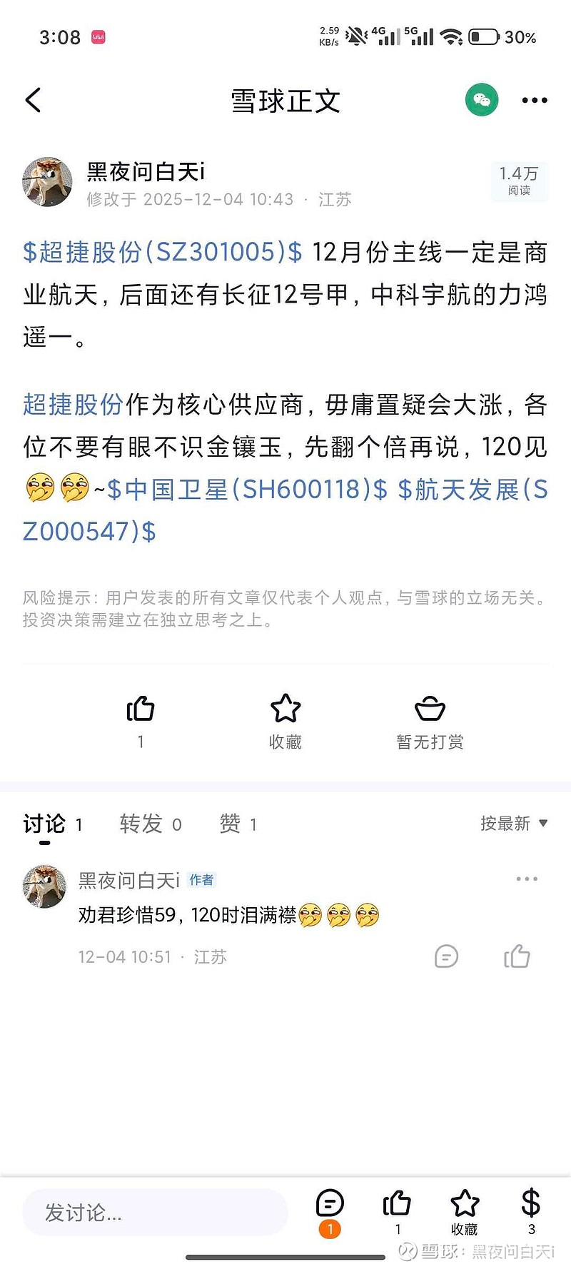 $超捷股份(SZ301005)$ 超捷股份火箭结构件25%,核心中的核心票,我之前说120见,现在82了,差不多两个涨停就118,很快的。铖昌科技,T/R组件的核心,卫星最大价值量,核心中的核心。可惜是5%涨幅,不然这个月100见只要你认准商业航天,这两个跑不掉的湖南黄金慢慢磨吧,等我赚了钱再回去吃注入对了,要是长征12甲发射成功,超捷股份下周就能120块钱$湖南黄金(SZ002155)$ $*ST铖昌(SZ001270)$