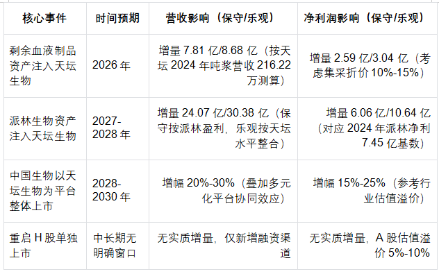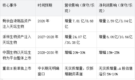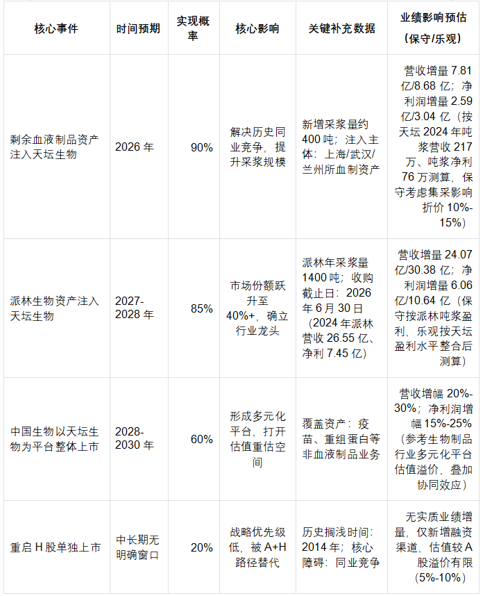 需说明的是,中国生物重启H股单独上市的概率极低(不足20%),一方面因历史搁浅后战略已明确转向平台整合,另一方面单独上市仍无法规避与天坛生物的潜在同业竞争,且通过天坛生物平台上市更具效率与估值优势。