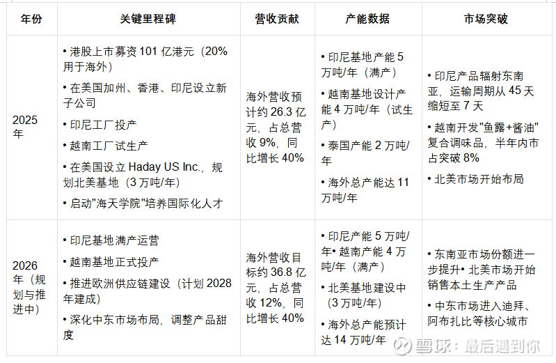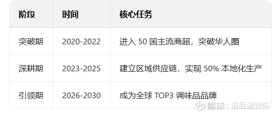 海天味业在2020年前后提出出海战略,近五年(2021-2026 年)出海以 “三步走” 战略为核心,聚焦东南亚、欧美等市场,通过研发本地化、产能建设、渠道拓展、组织升级与资本赋能,实现从出口到本土生产的跨越,目标是构建全球供应链与品牌影响力。