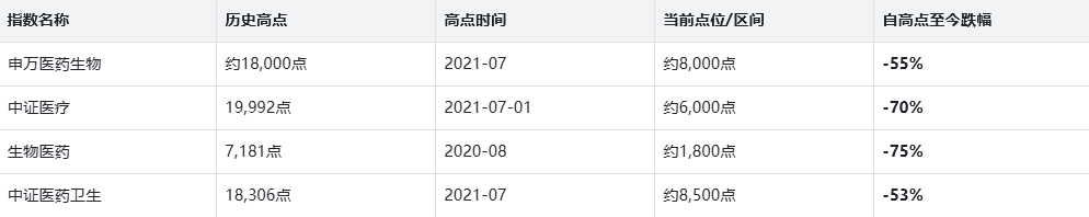 【医药各板块从历史高点到目前跌幅和历史最大跌幅统计】