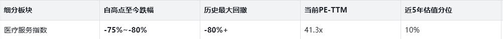 医疗服务指数:自2021年高点至今跌幅 -75%~-80%,最大回撤 -80%+