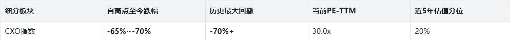 CXO指数:自2021年高点至今跌幅 -65%~-70%,最大回撤 -70%+