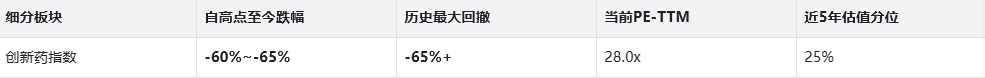 创新药指数:自2021年高点至今跌幅 -60%~-65%,最大回撤 -65%+