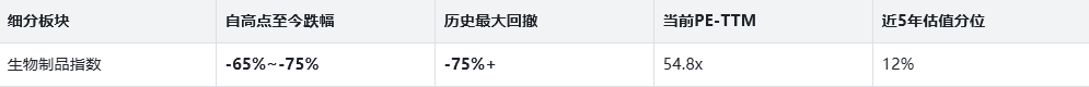 生物制品指数:自2021年高点至今跌幅 -65%~-75%,最大回撤 -75%+